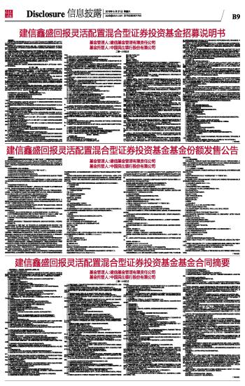 【重要提示】 1.建信鑫盛回报灵活配置混合型证券投资基金(以下简称“本基金”) 的募集及其基金份额的发售已经中国证券监督管理委员会2015年07月10日证监许可[2015]1572号文注册募集。并于2016年5月19日获得证券基金机构监管部关于建信鑫盛回报灵活配置混合型证券投资基金延期募集备案的回函(机构部函[2016]1064号)。中国证监会对本基金募集的注册并不代表中国证监会对本基金的风险和收益做出实质性判断、推荐或者保证。 2.本基金是契约型、开放式、混合型基金。 3.本基金的管理人为建信基金管理有限责任公司(以下简称“本公司”)。 4.本基金的托管人为中国民生银行股份有限公司。 5.本基金的基金登记机构为建信基金管理有限责任公司。 6.本基金自2016年5月26日至2016年6月3日通过基金管理人指定的销售机构发售,基金管理人可根据募集情况适当延长或缩短本基金的募集期限并及时公告。 7.本基金募集对象为符合法律法规规定的可投资于证券投资基金的个人投资者、机构投资者、合格境外机构投资者和人民币合格境外机构投资者以及法律法规或中国证监会允许购买证券投资基金的其他投资人。 8.本基金募集期内不设募集目标上限。 9.投资者欲认购本基金,需开立本公司基金账户。若已经在本公司开立基金账户的,则不需要再次办理开户手续。募集期内本基金的销售机构为投资者办理开户和认购手续。 10.认购以金额申请。代销网点每个基金账户每次认购金额不得低于10元人民币,代销机构另有规定的,从其规定。本公司直销柜台每个基金账户首次认购金额不得低于10元人民币,单笔追加认购最低金额为10元人民币;通过本公司网上交易平台认购本基金时,最低认购金额为10元人民币。 11.本基金募集期间对单个基金份额持有人不设置最高累计认购金额限制。 12.投资人在募集期内可以多次认购基金份额,但认购一经受理不得撤销。 13.销售机构对认购申请的受理并不代表该申请一定成功,而仅代表销售机构确实接收到认购申请。认购的确认以基金合同生效后基金份额登记机构的确认结果为准。投资者应在基金合同生效并正式发布生效公告后第二日起到原认购网点打印认购成交确认凭证。 14.本公告仅对本基金募集的有关事项和规定予以说明,投资者欲了解本基金的详细情况,请阅读《建信鑫盛回报灵活配置混合型证券投资基金招募说明书》。 15.销售机构销售本基金的城市名称、网点名称、联系方式以及开户和认购等具体事项详见各销售机构的相关业务公告。 16.在募集期间,除本公告所列示的销售机构外,如出现增加销售机构的情况,本公司将及时公告。 17.对未开设销售网点的地区的投资者,请拨打本公司的客户服务电话(010-66228000)、全国统一客服电话(400-81-95533,免长途通话费用)以及直销专线电话(010-66228800)咨询购买相关事宜。 18.基金管理人可综合各种情况依法对本基金募集安排做适当调整。 19.风险提示 基金管理人提示投资者充分了解基金投资的风险和收益特征,根据自身的风险承受能力,审慎选择适合自己的基金产品。 证券投资基金(以下简称“基金”)是一种长期投资工具,其主要功能是分散投资,降低投资单一证券所带来的个别风险。基金不同于银行储蓄和债券等能够提供固定收益预期的金融工具,投资者购买基金,既可能按其持有份额分享基金投资所产生的收益,也可能承担基金投资所带来的损失。 基金在投资运作过程中可能面临各种风险,既包括市场风险,也包括基金自身的管理风险、技术风险和合规风险等。巨额赎回风险是开放式基金所特有的一种风险,即当单个交易日基金的净赎回申请(赎回申请份额总数加上基金转换中转出申请份额总数扣除申购申请份额总数及基金转换中转入申请份额总数后的余额)超过基金总份额的百分之十时,投资者将可能无法及时赎回持有的全部基金份额。 基金分为股票基金、混合基金、债券基金、货币市场基金等不同类型,投资者投资不同类型的基金将获得不同的收益预期,也将承担不同程度的风险。一般来说,基金的收益预期越高,投资者承担的风险也越大。 投资者应当认真阅读《基金合同》、《招募说明书》等基金法律文件,了解基金的风险收益特征,并根据自身的投资目的、投资期限、投资经验、资产状况等判断基金是否和投资者的风险承受能力相适应。 投资者应当充分了解基金定期定额投资和零存整取等储蓄方式的区别。定期定额投资是引导投资者进行长期投资、平均投资成本的一种简单易行的投资方式。但是定期定额投资并不能规避基金投资所固有的风险,不能保证投资者获得收益,也不是替代储蓄的等效理财方式。 因拆分、分红等行为导致基金份额净值变化,不会改变基金的风险收益特征,不会降低基金投资风险或提高基金投资收益。以1元初始面值开展基金募集或因拆分、封转开、分红等行为导致基金份额净值调整至1元初始面值或1元附近,在市场波动等因素的影响下,基金投资仍有可能出现亏损或基金净值仍有可能低于初始面值。 基金管理人承诺以诚实信用、勤勉尽责的原则管理和运用基金资产,但不保证本基金一定盈利,也不保证最低收益。基金管理人管理的其他基金的业绩不构成对本基金业绩表现的保证。基金管理人提醒投资者基金投资的“买者自负”原则,