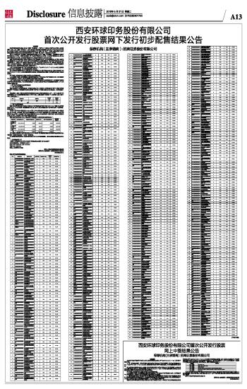 西安环球印务股份有限公司首次公开发行股票网下发行初步配售结果公告