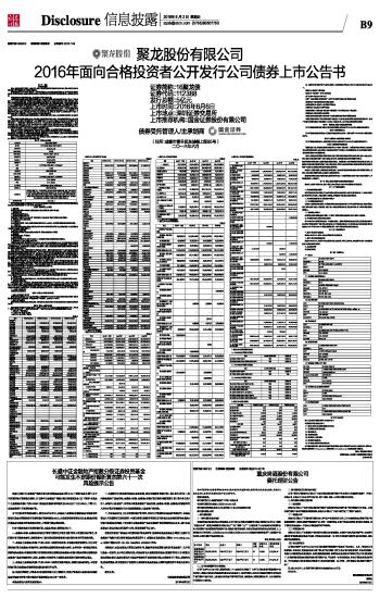 第一节 绪言 重要事项提示 发行人董事会成员已通过本上市公告书,发行人及其董事会承诺:保证公告内容真实、准确、完整,及对公告虚假记载、误导性陈述或重大遗漏负连带责任。 深圳证券交易所(以下简称“深交所”)对本期公司债券上市申请及相关事项的审查,均不构成对本期债券的价值、收益及兑付作出实质性判断或任何保证。因公司经营与收益变化等导致的投资风险,由投资者自行负责。 本期债券仅面向合格投资者发行,公众投资者不得参与发行认购。 合格投资者应当具备相应的风险识别和承担能力,知悉并自行承担公司债券的投资风险,并符合下列资质条件:(1)经有关金融监管部门批准设立的金融机构,包括证券公司、基金管理公司及其子公司、期货公司、商业银行、保险公司和信托公司等,以及经中国证券投资基金业协会(以下简称基金业协会)登记的私募基金管理人;(2)上述金融机构面向投资者发行的理财产品,包括但不限于证券公司资产管理产品、基金及基金子公司产品、期货公司资产管理产品、银行理财产品、保险产品、信托产品以及经基金业协会备案的私募基金;(3)净资产不低于人民币1000万元的企事业单位法人、合伙企业;(4)合格境外机构投资者(QFII)、人民币合格境外机构投资者(RQFII);(5)社会保障基金、企业年金等养老基金,慈善基金等社会公益基金;(6)名下金融资产(包括银行存款、股票、债券、基金份额、资产管理计划、银行理财产品、信托计划、保险产品、期货权益等)不低于人民币300万元的个人投资者;(7)中国证监会认可的其他合格投资者。 本期债券上市后将被实施投资者适当性管理,仅限合格投资者参与交易,公众投资者认购或买入的交易行为无效。 经远东资信评级有限公司综合评定,本公司的主体长期信用等级为AA级,本次债券信用等级为AA级。本期债券上市前,发行人最近一期末的净资产(含少数股东权益)为16.00亿元(截至2016年3月31日合并报表中所有者权益合计),母公司最近一期末净资产为15.94亿元(2016年3月31日母公司报表中所有者权益合计);截至2016年3月31日,本公司合并口径资产负债率为12.17%,母公司口径资产负债率为10.51%。本公司最近三个会计年度实现的年均可分配利润为3.00亿元(2013年、2014年及2015年归属于母公司所有者的净利润分别为2.72亿元、3.70亿元和2.60亿元),预计不少于本期债券一年利息的1.5倍。 发行人在本期债券上市前的财务指标符合发行条件,本期债券上市交易场所是深圳证券交易所。 本期债券上市前后,若公司财务状况、经营业绩、现金流和信用评级等情况出现重大变化将影响本次债券双边挂牌交易。本公司承诺,若本期债券无法双边挂牌,债券持有人有权在本期债券上市前向本公司回售全部或部分债券认购份额。本期债券上市后的流动性风险敬请投资者关注。 发行人在向深交所申请本次债券上市时,已与受托管理人约定,如果债券终止上市,发行人将委托该受托管理人提供终止上市后债券的托管、登记等相关服务。 第二节 发行人基本情况 ■ 关于本公司的具体信息,请见本公司于2016年5月9日披露的《聚龙股份有限公司2016年面向合格投资者公开发行公司债券募集说明书》(以下简称“募集说明书”)。 第三节 债券发行、上市概况 一、债券名称 聚龙股份有限公司2016年面向合格投资者公开发行公司债券,简称16聚龙债。 二、债券发行总额 本期债券面值总额为5亿元。 三、债券发行批准机关及文号 中国证监会“证监许可[2016]590号”文核准发行人向社会公开发行不超过5亿元公司债券。 四、债券的发行方式及发行对象 (一)发行方式 本次债券发行采取网下面向合格投资者询价配售的方式,由发行人与主承销商根据询价情况进行配售。 (二)发行对象 符合《公司债券发行与交易管理办法》规定并持有中国结算深圳分公司开立的A股证券账户的合格投资者(国家法律、法规禁止购买者除外)。 五、债券发行的主承销商 本期债券的主承销商为国金证券股份有限公司,采取余额包销的方式承销。 六、债券面额 本期债券面值100元,平价发行。 七、债券存续期限 本期债券存续期限为5年,附第3年末发行人上调票面利率选择权及投资者回售选择权。 八、债券年利率、计息方式和还本付息方式 本期债券为固定利率,票面利率为5.30%。发行人有权决定在存续期限的第3年末上调本期债券后2年的票面利率。发行人将于第3个计息年度付息日前的第20个交易日,在中国证监会指定的信息披露媒体上发布关于是否上调票面利率以及上调幅度的公告。若发行人未行使利率上调权,未被回售部分债券在债券存续期后2年票面利率仍维持原有票面利率不变。 发行人发出关于是否上调票面利率及上调幅度的公告后,投资者有权选择在第3个计息年度付息日将其持有的本期债券全部或部分按面值回售给发行人。第3个计息年度付息日即为回售支付日,发行人将按照深交所和登记机构相关业务规则完成回售支付工作。公司发出关于是否上调本期债券票面利率及上调幅度的公告之日起5个交易日内,行使回售权的债券持有人可通过指定的交易系统进行回售申报,债券持有人的回售申报经确认后不能撤销,相应的公司债券份额将被冻结交易;回售申报期不进行申报的,则视为放弃回售选择权,继续持有本期债券并接受上述关于是否上调