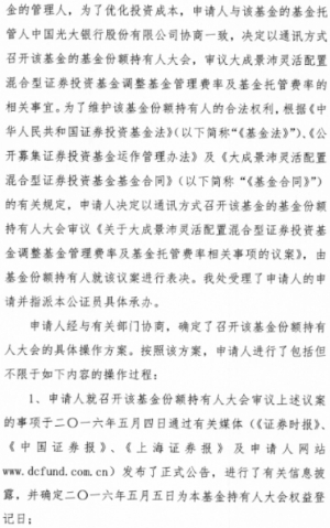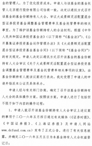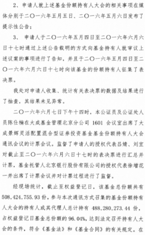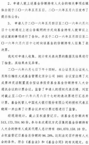 根据《中华人民共和国证券投资基金法》、《公开募集证券投资基金运作管理办法》等法律法规的规定和《大成景辉灵活配置混合型证券投资基金基金合同》(“《基金合同》”)的有关约定,现将大成景辉灵活配置混合型证券投资基金(以下简称“本基金”)基金份额持有人大会的表决结果、决议及相关事项公告如下: 一、本次基金份额持有人大会会议情况 大成基金管理有限公司(以下简称“本基金管理人”)旗下大成景辉灵活配置混合型证券投资基金的基金份额持有人大会以通讯方式召开。基金份额持有人大会权益登记日为2016年5月5日,大会表决投票时间为2016年5月4日起至2016年6月6日17:00止,会议审议了《关于大成景辉灵活配置混合型证券投资基金调整基金管理费率及基金托管费率相关事项的议案》(以下简称“本次会议议案”)。 2016年6月7日,在本基金的基金托管人授权代表的监督下,本基金管理人对本次大会表决进行了计票,北京市长安公证处对计票过程进行了公证,北京市金杜律师事务所对计票过程进行了见证。 基金持有人大会权益登记日本基金总份额为508,424,755.93份。本次基金份额持有人大会中,出具有效书面表决意见的基金份额持有人及代理人所代表的基金份额为488,280,273.44份,占权益登记日基金总份额的96.04 %,达到法定表决条件,符合《中华人民共和国证券投资基金法》、《公开募集证券投资基金运作管理办法》和《大成景辉灵活配置混合型证券投资基金基金合同》的有关持有人大会(通讯方式)的召开条件。 本次持有人大会的表决结果为:同意票所代表的基金份额为488,280,273.44份,占出具有效书面表决意见的基金份额持有人及代理人所代表的基金份额总数的100.00%;反对票所代表的基金份额为0.00份,占出具有效书面表决意见的基金份额持有人及代理人所代表的基金份额总数的0.00%,弃权票所代表的基金份额为0.00份,占出具有效书面表决意见的基金份额持有人及代理人所代表的基金份额总数的0.00%。 同意本次会议议案的基金份额占出具有效书面表决意见的基金份额持有人及代理人所代表的基金份额的二分之一以上,达到法定条件,符合《中华人民共和国证券投资基金法》、《公开募集证券投资基金运作管理办法》和《大成景辉灵活配置混合型证券投资基金基金合同》的有关规定,本次会议议案获得通过。 根据《大成景辉灵活配置混合型证券投资基金基金合同》的有关规定,本次基金份额持有人大会费用(公证费13,000.00元,律师费30,000.00元,合计43,000.00元)列入基金费用,由基金资产承担;其他费用由基金管理人承担。 二、本次基金份额持有人大会决议生效 根据《公开募集证券投资基金运作管理办法》的规定,基金份额持有人大会决定的事项自表决通过之日起生效。本次基金份额持有人大会于2016年6月7日表决通过了《关于大成景辉灵活配置混合型证券投资基金调整基金管理费率及基金托管费率相关事项的议案》,本次大会决议自该日起生效。基金管理人将自该日起五日内将表决通过的事项报中国证券监督管理委员会备案。 三、基金份额持有人大会决议相关事项实施情况 1、 关于大成景辉灵活配置混合型证券投资基金基金合同等法律文件的修订 根据《关于大成景辉灵活配置混合型证券投资基金调整基金管理费率及基金托管费率相关事项的议案》,基金管理人已对《大成景辉灵活配置混合型证券投资基金基金合同》、《大成景辉灵活配置混合型证券投资基金托管协议》进行修改,并据此修订了《大成景辉灵活配置混合型证券投资基金招募说明书》。 2、方案的实施安排 本基金管理人将根据基金份额持有人大会决议执行基金管理费率及托管费率的调整事项,将管理费费率调整为0.60%,托管费费率调整为0.10%,正式实施日为 2016 年 6 月 7 日。 四、备查文件 1、《大成基金管理有限公司关于召开大成景辉灵活配置混合型证券投资基金基金份额持有人大会(通讯方式)的公告》 2、《大成基金管理有限公司关于召开大成景辉灵活配置混合型证券投资基金基金份额持有人大会(通讯方式)的第一次提示性公告》 3、《大成基金管理有限公司关于召开大成景辉灵活配置混合型证券投资基金基金份额持有人大会(通讯方式)的第二次提示性公告》 4、《北京市长安公证处关于大成景辉灵活配置混合型证券投资基金基金份额持有人大会的公证书》 5、《北京市金杜律师事务所关于大成景辉灵活配置混合型证券投资基金基金份额持有人大会的法律意见书》 特此公告。 大成基金管理有限公司 二○一六年六月八日 ■ ■ ■ ■ 大成基金管理有限公司关于 大成景沛灵活配置混合型证券投资基金 基金份额持有人大会表决结果 暨决议生效的公告 根据《中华人民共和国证券投资基金法》、《公开募集证券投资基金运作管理办法》等法律法规的规定和《大成景沛灵活配置混合型证券投资基金基金合同》(“《基金合同》”)的有关约定,现将大成景沛灵活配置混合型证券投资基金(以下简称“本基金”)基金份额持有人大会的表决结果、决议及相关事项公告如下: 一、本次基金份额持有人大会会议情况 大成基金管理有限公司(以下简称“本基金管理人”)旗下大成景沛灵活配置混合型证券投资基金的基金份额持有人大会以通讯方式召开。基金份额持有人大