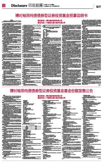 【重要提示】 1、本基金根据2015年11月6日中国证券监督管理委员会(以下简称“中国证监会”)《关于准予博时裕昂纯债债券型证券投资基金注册的批复》(证监许可[2015]2528号)进行募集。 2、基金管理人保证招募说明书的内容真实、准确、完整。本招募说明书经中国证监会注册,但中国证监会对本基金募集的注册,并不表明其对本基金的投资价值和市场前景作出实质性判断或保证,也不表明投资于本基金没有风险。 3、投资有风险,投资者认购(或申购)基金份额时应认真阅读基金合同、本招募说明书等信息披露文件,自主判断基金的投资价值,全面认识本基金产品的风险收益特征,应充分考虑投资者自身的风险承受能力,并对认购(或申购)基金的意愿、时机、数量等投资行为作出独立决策。基金管理人提醒投资者基金投资的“买者自负”原则,在投资者作出投资决策后,基金运营状况与基金净值变化导致的投资风险,由投资者自行负担。 4、本基金投资于证券市场,基金净值会因为证券市场波动等因素产生波动,投资者在投资本基金前,应全面了解本基金的产品特性,理性判断市场,并承担基金投资中出现的各类风险,包括:因政治、经济、社会等环境因素对证券价格产生影响而形成的系统性风险、个别证券特有的非系统性风险、基金管理人在基金管理实施过程中产生的基金管理风险、本基金的特定风险等等。 本基金投资中小企业私募债,中小企业私募债是根据相关法律法规由非上市中小企业采用非公开方式发行的债券。由于不能公开交易,一般情况下,交易不活跃,潜在较大流动性风险。当发债主体信用质量恶化时,受市场流动性所限,本基金可能无法卖出所持有的中小企业私募债,由此可能给基金净值带来更大的负面影响和损失。 5、本基金为债券型基金,预期收益和预期风险高于货币市场基金,但低于混合型基金、股票型基金,属于较低预期风险/收益的产品。 6、本基金的投资范围主要为具有良好流动性的固定收益类品种,包括国债、金融债、企业债、公司债、央行票据、中期票据、短期融资券、中小企业私募债、资产支持证券、次级债、可分离交易可转债的纯债部分、债券回购、银行存款等法律法规或中国证监会允许基金投资的其他固定收益类金融工具(但须符合中国证监会的相关规定)。 本基金不投资于股票、权证等权益类资产,也不投资于可转换债券(可分离交易可转债的纯债部分除外)、可交换债券。 如法律法规或监管机构以后允许基金投资其他品种,基金管理人在履行适当程序后,可以将其纳入投资范围。 7、基金的投资组合比例为:本基金对债券的投资比例不低于基金资产的80%;本基金持有现金或者到期日在一年以内的政府债券投资比例不低于基金资产净值的5%。 8、本基金初始募集面值为人民币1.00 元。在市场波动因素影响下,本基金净值可能低于初始面值,本基金投资者有可能出现亏损。 9、基金的过往业绩并不预示其未来表现,基金管理人管理的其他基金的业绩也不构成对本基金业绩表现的保证。 10、基金管理人依照恪尽职守、诚实信用、谨慎勤勉的原则管理和运用基金财产,但不保证基金一定盈利,也不保证最低收益。 第一部分 绪言 《博时裕昂纯债债券型证券投资基金招募说明书》(以下简称“招募说明书”或“本招募说明书”)依照《中华人民共和国证券投资基金法》(以下简称“《基金法》”)、《公开募集证券投资基金运作管理办法》(以下简称“《运作办法》”)、《证券投资基金销售管理办法》(以下简称“《销售办法》”)、《证券投资基金信息披露管理办法》(以下简称“《信息披露办法》”)和其他有关法律法规以及《博时裕昂纯债债券型证券投资基金基金合同》(以下简称“基金合同”)编写。 本招募说明书阐述了博时裕昂纯债债券型证券投资基金的投资目标、策略、风险、费率等与投资人投资决策有关的必要事项,投资人在作出投资决策前应仔细阅读本招募说明书。 基金管理人承诺本招募说明书不存在任何虚假记载、误导性陈述或重大遗漏,并对其真实性、准确性、完整性承担法律责任。 博时裕昂纯债债券型证券投资基金(以下简称“基金”或“本基金”)是根据本招募说明书所载明的资料申请募集的。本基金管理人没有委托或授权任何其他人提供未在本招募说明书中载明的信息,或对本招募说明书作任何解释或者说明。 本招募说明书根据本基金的基金合同编写,并经中国证监会注册。基金合同是约定基金合同当事人之间权利、义务的法律文件。基金投资者自依基金合同取得基金份额,即成为基金份额持有人和基金合同的当事人,其持有基金份额的行为本身即表明其对基金合同的承认和接受,并按照《基金法》、基金合同及其他有关规定享有权利、承担义务。基金投资者欲了解基金份额持有人的权利和义务,应详细查阅基金合同。 第二部分 释义 在本招募说明书中,除非文义另有所指,下列词语具有以下含义: 1、基金或本基金:指博时裕昂纯债债券型证券投资基金 2、基金管理人:指博时基金管理有限公司 3、基金托管人:指中国民生银行股份有限公司 4、基金合同:指《博时裕昂纯债债券型证券投资基金基金合同》及对基金合同的任何有效修订和补充 5、托管协议:指基金管理人与基金托管人就本基金签订之《