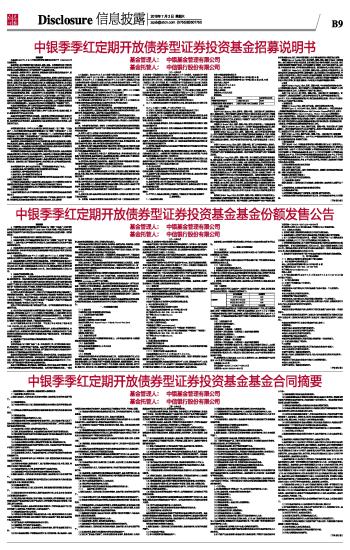 重要提示 本基金经2016年6月24日中国证券监督管理委员会证监许可【2016】1401号文注册募集。 基金管理人保证招募说明书的内容真实、准确、完整。本招募说明书经中国证监会注册,但中国证监会对本基金募集的注册,并不表明其对本基金的投资价值和市场前景作出实质性判断或保证,也不表明投资于本基金没有风险。 基金管理人依照恪尽职守、诚实信用、谨慎勤勉的原则管理和运用基金财产,但不保证本基金一定盈利,也不保证最低收益。 投资有风险,投资者根据所持有份额享受基金的收益,但同时也要承担相应的投资风险。投资者认购(或申购)基金时应认真阅读本招募说明书和基金合同等信息披露文件,全面认识本基金产品的风险收益特征,自主判断基金的投资价值,自主做出投资决策,并自行承担基金投资中出现的各类风险,包括:因政治、经济、社会等环境因素对证券价格产生影响而形成的系统性风险,个别证券特有的非系统性风险,由于基金投资者连续大量赎回基金产生的流动性风险,基金管理人在基金管理实施过程中产生的基金管理风险,等等。本基金投资中小企业私募债券,中小企业私募债是根据相关法律法规由非上市中小企业采用非公开方式发行的债券。由于不能公开交易,一般情况下,交易不活跃,潜在较大流动性风险。当发债主体信用质量恶化时,受市场流动性所限,本基金可能无法卖出所持有的中小企业私募债,由此可能给基金净值带来更大的负面影响和损失。本基金的特定风险详见招募说明书“风险揭示”章节。 本基金为债券型基金,属于证券投资基金中的较低风险品种,本基金的预期收益和预期风险高于货币市场基金,低于混合型基金和股票型基金。 投资者应充分考虑自身的风险承受能力,并对于认购(或申购)基金的意愿、时机、数量等投资行为作出独立决策。 基金的过往业绩并不预示其未来表现,基金管理人管理的其他基金的业绩也不构成对本基金业绩表现的保证。基金管理人提醒投资者基金投资的“买者自负”原则,在投资者作出投资决策后,基金运营状况与基金净值变化引致的投资风险,由投资者自行负责。 一、绪言 本招募说明书依据《中华人民共和国证券投资基金法》(以下简称“《基金法》”)、《公开募集证券投资基金运作管理办法》(以下简称“《运作办法》”)、《证券投资基金销售管理办法》(以下简称“《销售办法》”)、《证券投资基金信息披露管理办法》(以下简称“《信息披露办法》”)及其他有关法律法规以及《中银季季红定期开放债券型证券投资基金基金合同》编写。 基金管理人承诺本招募说明书不存在任何虚假记载、误导性陈述或者重大遗漏,并对其真实性、准确性、完整性承担法律责任。本基金是根据本招募说明书所载明的资料申请募集的。本基金管理人没有委托或授权任何其他人提供未在本招募说明书中载明的信息,或对本招募说明书作任何解释或者说明。 本招募说明书根据本基金的基金合同编写,并经中国证监会注册。基金合同是约定基金合同当事人之间权利、义务的法律文件。基金投资人自依基金合同取得基金份额,即成为基金份额持有人和基金合同的当事人,其持有基金份额的行为本身即表明其对基金合同的承认和接受,并按照《基金法》、基金合同及其他有关规定享有权利、承担义务。基金投资人欲了解基金份额持有人的权利和义务,应详细查阅基金合同。 二、释义 在本招募说明书中,除非文意另有所指,下列词语或简称具有如下含义: 1、基金或本基金:指中银季季红定期开放债券型证券投资基金 2、基金管理人:指中银基金管理有限公司 3、基金托管人:指中信银行股份有限公司 4、基金合同:指《中银季季红定期开放债券型证券投资基金基金合同》及对基金合同的任何有效修订和补充 5、托管协议:指基金管理人与基金托管人就本基金签订之《中银季季红定期开放债券型证券投资基金托管协议》及对该托管协议的任何有效修订和补充 6、招募说明书或本招募说明书:指《中银季季红定期开放债券型证券投资基金招募说明书》及其定期的更新 7、基金份额发售公告:指《中银季季红定期开放债券型证券投资基金基金份额发售公告》 8、法律法规:指中国现行有效并公布实施的法律、行政法规、规范性文件、司法解释、行政规章以及其他对基金合同当事人有约束力的决定、决议、通知等 9、《基金法》:指2003年10月28日经第十届全国人民代表大会常务委员会第五次会议通过,2012年12月28日第十一届全国人民代表大会常务委员会第三十次会议修订,自2013年6月1日起实施,并经2015年4月24日第十二届全国人民代表大会常务委员会第十四次会议《全国人民代表大会常务委员会关于修改<中华人民共和国港口法>等七部法律的决定》修改的《中华人民共和国证券投资基金法》及颁布机关对其不时做出的修订 10、《销售办法》:指中国证监会2013年3月15日颁布、同年6月1日实施的《证券投资基金销售管理办法》及颁布机关对其不时做出的修订 11、《信息披露办法》:指中国证监会2004年6月8日颁布、同年7月1日实施的《证券投资基金信息披露管理办法》及颁布机关对其不时做出的修订 12、《运作办法》:指中国证监会2014年7月7日颁布、同年8月8日实施的《公开募集证券投资基金运作管理办法
