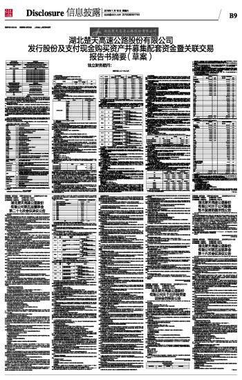 ■ 公司声明 本报告书摘要的目的仅为向公众提供有关本次重组的简要情况,并不包括《湖北楚天高速公路股份有限公司发行股份及支付现金购买资产并募集配套资金暨关联交易报告书(草案)》全文的各部分内容。《湖北楚天高速公路股份有限公司发行股份及支付现金购买资产并募集配套资金暨关联交易报告书(草案)》全文同时刊载于巨潮资讯网(http://www.cninfo.com.cn);备查文件置备于上市公司住所及独立财务顾问住所。 本公司及全体董事、监事、高级管理人员保证本报告书及摘要内容的真实、准确、完整,对本报告书的虚假记载、误导性陈述或重大遗漏负连带责任。 本公司财务负责人和主管会计工作的负责人、会计机构负责人保证本报告书及其摘要中财务会计资料真实、完整。 本次发行股份及支付现金的交易对方三木投资、九番投资、诺球电子、张旭辉、云亚峰、杨海燕、黄国昊、张黎君、叶培锋、熊胜峰、黄日红、张建辉和配套募集资金的认购对象湖北交投集团、广发原驰·楚天高速1号定向资产管理计划(楚天高速2016年度员工持股计划)的管理人广证资管及105名参与人、稳润投资、三友正亚、天安财险和姚绍山已出具承诺函,保证其为本次发行股份购买资产并募集配套资金所提供的有关信息具备真实性、准确性和完整性,不存在虚假记载、误导性陈述或者重大遗漏,并对所提供信息的真实性、准确性和完整性承担个别和连带的法律责任。 本次发行股份购买资产并募集配套资金的生效和完成尚需取得有关审批机关的批准和核准。审批机关对于本次发行股份购买资产相关事项所做的任何决定或意见,均不表明其对本公司股票的价值或投资者的收益作出实质性判断或保证。