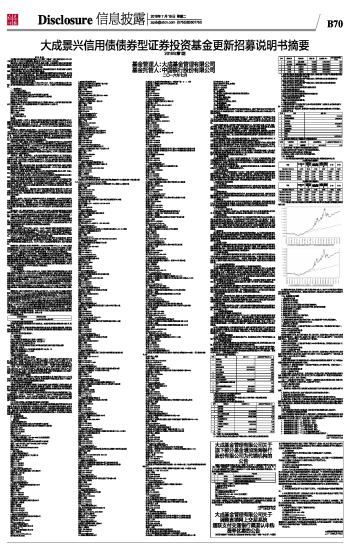 注:按基金合同规定,基金管理人应当自基金合同生效之日起六个月内使基金的投资组合比例符合基金合同的有关约定。截至建仓期结束时,本基金的各项投资比例已达到基金合同中规定的比例。 十五. 基金的费用与税收 一、基金费用的种类 1、基金管理人的管理费; 2、基金托管人的托管费; 3、《基金合同》生效后与基金相关的信息披露费用; 4、《基金合同》生效后与基金相关的会计师费、律师费和诉讼费; 5、基金份额持有人大会费用; 6、基金的证券交易费用; 7、基金的银行汇划费用; 8、基金的账户开户费用、账户维护费用; 9、C 类基金份额的销售服务费; 10、按照国家有关规定和《基金合同》约定,可以在基金财产中列支的其他费用。 二、基金费用计提方法、计提标准和支付方式 1、基金管理人的管理费 本基金的管理费按前一日基金资产净值的0.70%年费率计提。管理费的计算方法如下: H=E×0.70%÷当年天数 H为每日应计提的基金管理费 E为前一日的基金资产净值 基金管理费每日计算,逐日累计至每月月末,按月支付,由基金管理人向基金托管人发送基金管理费划款指令,基金托管人复核后于次月前3个工作日内从基金财产中一次性支付给基金管理人。若遇法定节假日、公休假等,支付日期顺延。 2、基金托管人的托管费 本基金的托管费按前一日基金资产净值的0.20%的年费率计提。托管费的计算方法如下: H=E×0.20%÷当年天数 H为每日应计提的基金托管费 E为前一日的基金资产净值 基金托管费每日计算,逐日累计至每月月末,按月支付,由基金管理人向基金托管人发送基金托管费划款指令,基金托管人复核后于次月前3个工作日内从基金财产中一次性支取。若遇法定节假日、公休日等,支付日期顺延。 3、销售服务费 本基金A类基金份额不收取销售服务费,C类基金份额的销售服务费将专门用于本基金C类基金份额的销售与基金份额持有人服务。 在通常情况下,销售服务费按前一日基金资产净值的0.4%年费率计提。计算方法如下: H=E×0.4%÷当年天数 H为每日应计提的销售服务费 E为前一日基金资产净值 销售服务费每日计提,按月支付。由基金管理人向基金托管人发送基金销售服务费划付指令,经基金托管人复核后于次月首日起3个工作日内从基金财产中一次性支付给销售机构,若遇法定节假日、休息日,支付日期顺延。 上述“一、基金费用的种类中第3-8项费用”,根据有关法规及相应协议规定,按费用实际支出金额列入当期费用,由基金托管人从基金财产中支付。 三、不列入基金费用的项目 下列费用不列入基金费用: 1、基金管理人和基金托管人因未履行或未完全履行义务导致的费用支出或基金财产的损失; 2、基金管理人和基金托管人处理与基金运作无关的事项发生的费用; 3、《基金合同》生效前的相关费用; 4、其他根据相关法律法规及中国证监会的有关规定不得列入基金费用的项目。 四、基金管理人和基金托管人可根据基金发展情况调整基金管理费率、基金托管费率和基金销售服务费率。降低基金管理费率、基金托管费率和销售服务费率,无须召开基金份额持有人大会。基金管理人必须依照有关规定最迟于新的费率实施日前在指定媒体和基金管理人网站上刊登公告。 五、基金税收 本基金运作过程中涉及的各纳税主体,其纳税义务按国家税收法律、法规执行。 十六. 对招募说明书更新部分的说明 本更新的招募说明书依据《基金法》、《运作办法》、《销售办法》、《信息披露办法》及其他有关法律法规的要求,对2016年1月19日公布的《大成景兴信用债债券型证券投资基金更新招募说明书(2015年2期)》进行了补充和更新,主要修改内容如下: 1.根据最新资料,更新了“三、基金管理人”部分。 2.根据最新资料,更新了“四、基金托管人”部分。 3.根据最新资料,更新了“五、相关服务机构”部分。 4.根据最新数据,更新了“十二、基金的投资”部分。 5.根据最新数据,更新了“十三、基金的业绩”部分。 6.根据最新公告,更新了“二十五、其他应披露的事项”。 7.根据最新情况,更新了“二十六、招募说明书更新部分的说明”。 大成基金管理有限公司 二〇一六年七月十九日 本版导读: