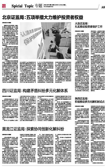 为贯彻落实国务院办公厅《关于完善矛盾纠纷多元化解机制的意见》精神,落实关于证券期货纠纷多元化解机制试点工作通知要求,四川证监局近日向证监会投保局报送了《构建矛盾纠纷多元化解体系 切实维护投资者合法权益》的函。 四川证监局表示,前期已同省高级人民法院建立长效沟通机制,结合四川辖区纠纷调解实际情况,就试点工作主要内容进行研讨,并就下一步积极推进相关工作达成共识,力争在工作中实现“维护公开、公平、公正的资本市场秩序,促进资本市场的和谐健康发展”的共同目标。 据介绍,四川证监局建立了全局分工协作的投资者诉求处理工作机制,由投保处作为“窗口”,统一负责投资者诉求处理,建立信访、举报、投诉转办三个信息子系统,搭建起一站式受理督办平台,形成“统一入口、分类办理、电子留痕、重在解决”的投资者诉求处理工作机制,提高投资者诉求处置效率。 2013年底,四川证监局指导辖区行业协会成立纠纷调解中心,积极参与辖区投资者纠纷调解工作。调解中心自成立以来,受理投资者纠纷103起,成功调解纠纷90起,投资者获取赔偿金额49.11万元,切实保护了中小投资者合法权益,对维护辖区证券期货市场的和谐稳定起到了积极的作用。2016年,又与中证中小投资者服务中心有限责任公司、辖区行业协会共同签订合作协议,成立四川辖区证券期货纠纷调解中心,正式启动证券期货行业纠纷快速调解机制试点工作。 在加强司法衔接方面,四川证监局表示,已探索建立诉调对接机制。2014年,指导辖区行业协会与成都市中级人民法院签订《关于建立四川辖区证券期货纠纷诉调对接机制的指导意见》,就探索建立诉调对接机制取得共识,行业协会调解中心加入成都中院调解组织名册,积极探索通过委派调解、委托调解、邀请调解等多种形式实现诉调对接,并进行专业协作,共同实现纠纷的合理合法合情解决。 四川证监局表示,将积极打造仲裁“直通车”,给纠纷当事人提供更加多元化的纠纷解决路径,推动辖区证券期货业协会与成都金融仲裁院签订合作备忘录,纠纷双方可就调解协议书直接提请仲裁委制作仲裁书,同时要求辖区证券期货机构在格式文本中加入仲裁条款,提高仲裁渠道解决纠纷的效率。 据了解,四川证监局相继派出4名处级干部参加成都仲裁院,担任金融仲裁员,积极指导和参与证券期货纠纷案件仲裁,推进金融仲裁在投资者诉求处理和矛盾纠纷化解中发挥作用。 此外,四川证监局还与四川省信访办建立对接机制,促进息诉罢访。 四川证监局表示,建立健全矛盾纠纷多元化解机制是一项长期任务,是化解社会矛盾,减少诉讼和信访压力的治本之策,重在社会各方的共同参与。下一步,将在舆论引导、宣传教育、仲调对接、诉调对接以及法律援助等方面继续深入探索和完善纠纷多元化解机制。 本版导读: