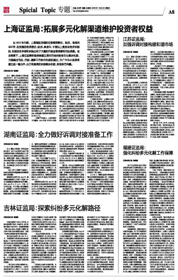 《关于在全国部分地区开展证券期货纠纷多元化解机制试点工作的通知》出台后,福建证监局表示,建立健全证券期货纠纷多元化解机制是集各方合力深化改革创新,让投资者得到实实在在获得感的重要途径;是进一步畅通投资者诉求表达渠道,有效化解矛盾纠纷的有力抓手。福建证监局将积极贯彻《通知》,凝聚各方力量,多元融合,协调联动,畅通投资者诉求表达渠道,依法、公正、高效化解证券期货纠纷,全力将辖区证券期货纠纷多元化解机制试点工作落到实处。 一是凝聚力量,发挥纠纷多元化解积极作用。推动形成证券期货监管机构、行业自律组织、试点调解组织、司法机构一盘棋、社会参与总动员的工作格局,有机衔接、相互协调,形成证券期货纠纷化解强大合力。搭建诉调对接平台、小额速调平台、专业解纷平台。深度融合法定途径分类处理投资者诉求工作与纠纷多元化解机制建设。着力完善相关制度建设,推动形成专业性、灵活性、快捷性的“一站式”证券期货纠纷多元化解机制。 二是创新机制,构筑纠纷多元化解坚实基础。如广泛开展投资者调研,充分了解纠纷类型、投资者对多元化解机制的要求,并针对性地提供争议解决途径。积极开展与试点调解组织合作,通过签订备忘录等方式引入试点调解组织的专业力量。推动福建省证券期货业协会与福州市仲裁委员会合作成立了福州仲裁委员会证券期货仲裁中心,制定仲裁调解规则,为投资者维权提供便利。将进一步推动辖区行业协会健全行业调解制度,探索建立小额纠纷快速解决机制,充分借助互联网技术创新开展视频调解、网络对话等。加强与福建省各级人民法院协调联动,共同完成证券期货纠纷诉讼与非诉讼调解方式在程序安排、效力确定、法律指导方面的有机衔接,通过健诉调对接机制,将诉前、诉中调解与司法判决有机结合,最大限度地将消极因素转换为积极因素,实现调解效果最大化。 三是广泛宣传,增进纠纷多元化解社会认知。一是组织辖区证券期货经营机构通过发放宣传手册、制作宣传短片、举办户外活动、官方网站、行情软件等多种方式宣传证券期货纠纷多元化解渠道。二是充分利用辖区国家级投资者教育基地作为宣传阵地,通过咨询答疑、专题讲座、知识竞赛等方式解读多元化解机制试点工作,深入讲解试点工作原则、试点范围、工作机制、试点调解组织等相关内容。三是积极开展典型案例宣传活动。四是推动签订自律承诺书。推动辖区证券期货经营机构、上市公司等市场主体签订自愿配合纠纷调解的自律承诺书。通过自律承诺,在辖区市场主体中宣传多元化解机制试点工作,促进辖区市场主体主动参与多元化解机制,积极履行调解、和解协议,依法解决与中小投资者的纠纷。 四是立足监管,强化纠纷多元化解工作保障。为确保辖区证券期货纠纷多元化解试点工作顺利开展,福建证监局立足监管本位,多措并举强化纠纷多元化解工作保障。一是落实投资者适当性管理。全面提高依法规范经营意识,从源头上预防和减少投诉纠纷。二是压实市场主体投诉处理首要责任。将证券期货纠纷化解在萌芽状态,防止出现因处理不及时或不妥当导致矛盾激化升级。三是强化多元化解考核评价工作。要求各市场主体积极配合参与多元化解工作,并将参与情况作为投资者保护工作评价标准列入现场检查和年终考评工作范围,针对无正当理由而拒不配合纠纷多元化解工作的市场经营主体采取一票否决。四是严厉打击各类损害投资者合法权益的行为。加强联动执法力度,针对多元化解工作中发现的违法违规行为坚持“零容忍”,及时严肃予以查处,并记入资本市场诚信数据库,发挥诚信信息约束和惩戒作用。 本版导读: