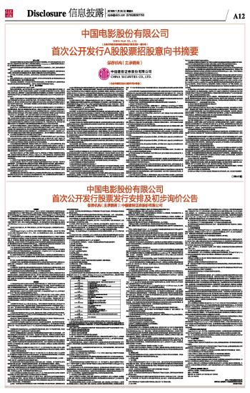 中国电影股份有限公司首次公开发行A股股票招股意向书摘要 2016-07-20 来源:证券时报网 作者: