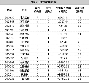 9月26日,沪深两市仅有3只个股出现机构席位净买入,其余13只个股均为机构净卖出。总体来看,机构合计买入金额为1.14亿元,但机构卖出额却高达2.47亿元,净卖出额为1.33亿元。