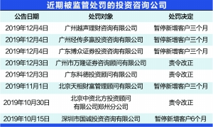 近日,广东证监局对两家投资咨询机构下发监管函后,再对另外3家投资咨询公司进行处罚,且均责令这些公司暂停新增客户3个月。