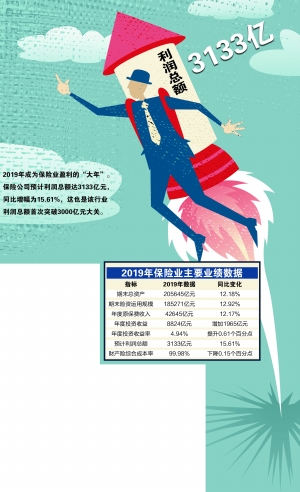 证券时报记者最新获悉,2019年保险公司预计利润总额3133亿元,同比增加423亿元,增长幅度为15.61%。同时,这也是行业利润总额首次突破3000亿元,2019年成为保险业盈利的“大年”。