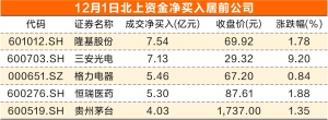 12月1日成交活跃股中,隆基股份、三安光电、格力电器获北上资金净买入金额居前,其中隆基股份净买入金额创下了今年以来净买入次新高,达到7.54亿元。另外,北上资金加大了银行股买入力度,招商银行、兴业银行均上榜成交活跃股。