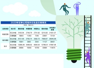 公开数据显示,2020年12月,证券公司开展场外金融衍生品交易新增初始名义本金5499.53亿元,较11月份增长3.22%;截至2020年末,场外金融衍生品存续未了结初始名义本金合计1.28万亿元,较2019年12月增幅达105%。