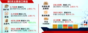 此外,基数效应对进口同比走高也形成了明显支撑。旺盛的出口带动国内生产维持韧性,企业需要增加设备和相关原材料的储备。数据显示,前5个月,我国进口机电产品2.87万亿元,增长21.8%,同比增速较前4个月提升。