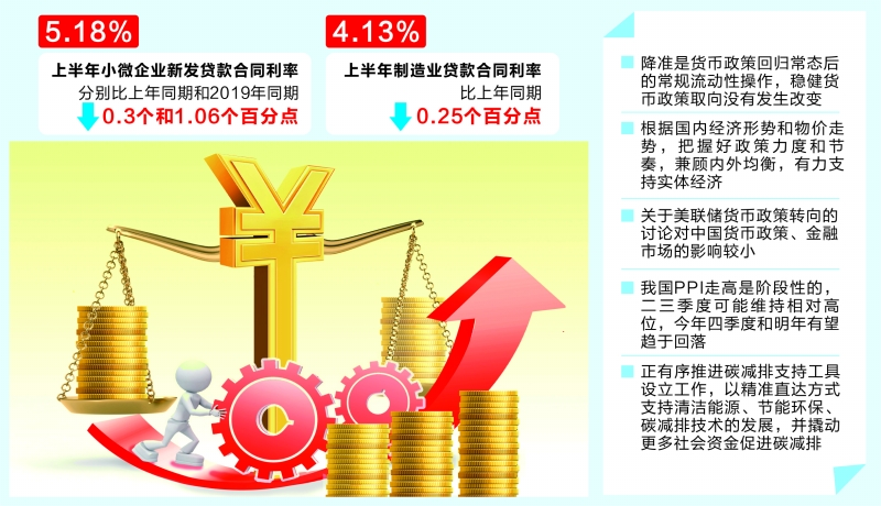 阮健弘也表示,上半年,小微企业新发贷款合同利率5.18%,分别比上年同期和2019年同期低0.3个和1.06个百分点,制造业贷款合同利率4.13%,比上年同期低0.25个百分点。此次全面降准降低了金融机构的资金成本每年约130亿元,通过金融机构传导可促进降低社会综合融资成本。