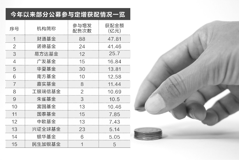 从参与定增的公司看,财通基金参与88次增发配售,累计获配投入资金47.81亿元,在配售次数和获配金额上都位居首位;诺德、易方达基金分列二、三位,今年以来定增获配投入资金分别为41.46亿元、25.7亿元。