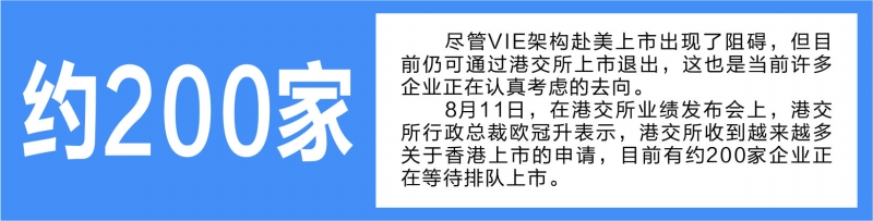 尽管VIE架构赴美上市出现了阻碍,但目前仍可通过港交所上市退出,这也是当前许多企业正在认真考虑的去向。8月11日,在港交所业绩发布会上,港交所行政总裁欧冠升表示,港交所收到越来越多关于香港上市的申请,目前有约200家企业正在等待排队上市。