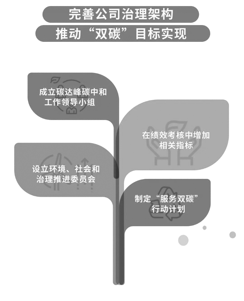完善公司治理架构,推动“双碳”目标实现。建设银行持续推动完善ESG和绿色金融管理架构,强化绿色金融工作考核评价。成立碳达峰碳中和工作领导小组,制定和统筹推进“服务碳达峰、碳中和”行动计划;设立环境、社会和治理推进委员会,推进落实ESG相关工作;在绩效考核中增加“服务生态文明战略情况”指标,扩大考核部门范围,提高绿色金融考核权重。