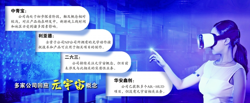 此外,多家上市公司撇清与元宇宙的关系。二六三表示公司持续关注元宇宙概念,但目前未涉及与此相关的实质性业务;宇信科技、海联金汇、华凯创意、祥源文化、纵横通信均表示并未涉及相关业务。华安鑫创则表示公司已获取多个AR-HUD项目,但也没有元宇宙相关业务。