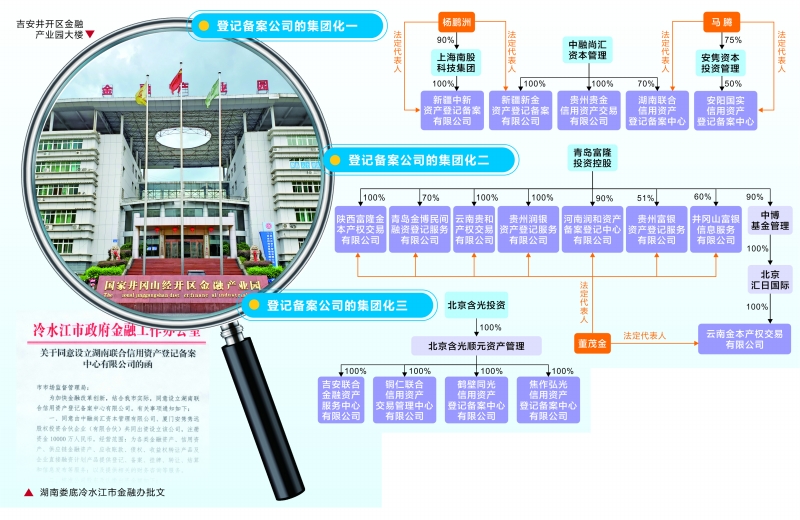 集团化代表一:马腾本人担任湖南联合登记等两家公司的法定代表人,湖南联合登记的股东之一——中融尚汇资本管理有限公司,又是新疆新金资产登记备案有限公司(下称“新疆新金登记”)等3家公司的控股股东。而新疆新金登记的法定代表人杨鹏洲,也是与该公司同一天注册成立的另一家备案公司——新疆中新资产登记备案有限公司的法定代表人。