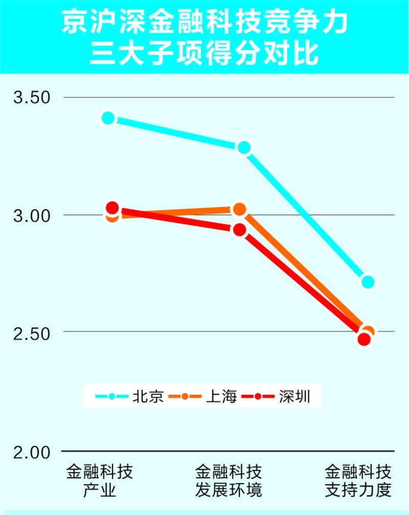 根据榜单数据,北京金融科技竞争力综合得分为9.42分,分别比沪深高出0.89分和0.99分,实力略胜一筹;上海金融科技竞争力综合得分险胜深圳,仅高出0.1分。