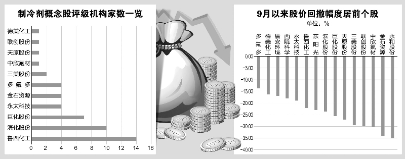 8月15日至今,申万氟化工及制冷剂指数累计上涨19.48%,永太科技、东阳光、金石资源和三美股份上涨超20%。不过,受限电政策影响,作为高耗能的化工板块,制冷剂概念股大幅回落。相较于9月的高点,概念股股价平均回撤超过24%,中欣氟材、金石资源、永和股份3只个股回撤幅度超过30%,巨化股份、天原股份、三美股份、联创股份回撤均在25%以上。