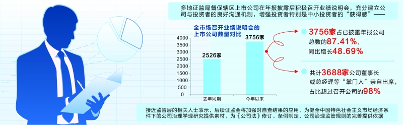 统计显示,今年以来全市场召开业绩说明会的上市公司总计3756家,占已披露年报公司总数的87.41%,相比去年同期的2526家增长了48.69%。共计3688家公司董事长或总经理等“掌门人”亲自出席,占比超过召开公司的98%。通过“关键少数”与投资者的“零距离交流”,提升了公司与投资者互动的深度、广度和效果,也加深了管理层对资本市场工作和投资者关系管理的认识和重视程度。