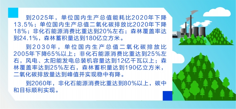 10月24日,中共中央、国务院发布《关于完整准确全面贯彻新发展理念做好碳达峰碳中和工作的意见》(下称《意见》)。《意见》提出,到2025年,绿色低碳循环发展的经济体系初步形成,重点行业能源利用效率大幅提升。到2030年,经济社会发展全面绿色转型取得显著成效,重点耗能行业能源利用效率达到国际先进水平。到2060年,绿色低碳循环发展的经济体系和清洁低碳安全高效的能源体系全面建立,能源利用效率达到国际先进水平,非化石能源消费比重达到80%以上。