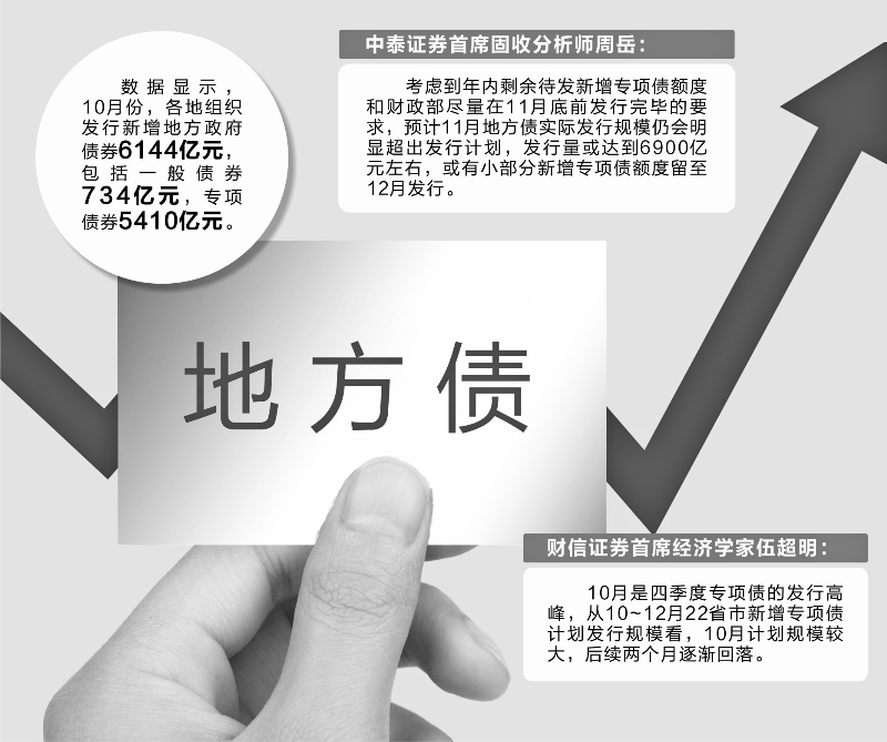中泰证券首席固收分析师周岳认为,截至10月末,共有21个省份和5个计划单列市披露了11~12月地方债发行计划,合计规模5999亿元,其中11月计划发行5010亿元。考虑到年内剩余待发新增专项债额度和财政部尽量在11月底前发行完毕的要求,预计11月地方债实际发行规模仍会明显超出发行计划,发行量或达到6900亿元左右,或有小部分新增专项债额度留至12月发行。