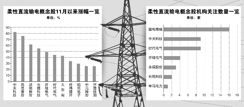 证券时报·数据宝统计,A股市场柔性直流输电概念股共计20只;概念以中小市值股居多,13只个股最新总市值不足百亿。国电南瑞居首,总市值达到2412.27亿元;时代电气、中天科技随后,总市值均在500亿元以上。