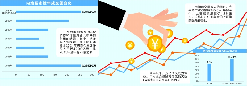 今年内地股票市场还剩下两个交易日,但两市2021年以来成交额约256万亿元,已超过历史上最高年份的2015年全年,刷新年度历史新高。