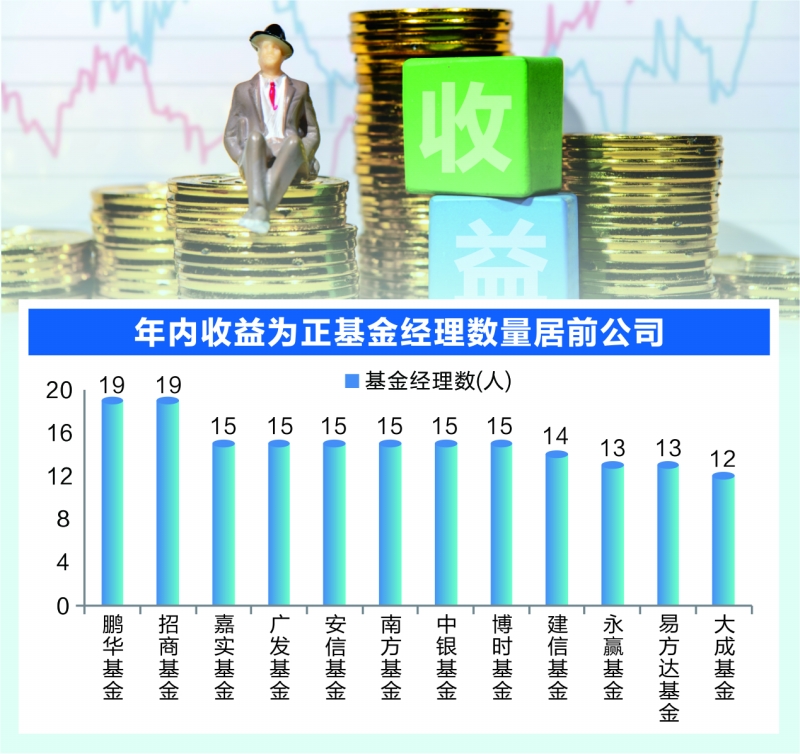 从基金公司角度来看,招商基金、嘉实基金、广发基金、安信基金、南方基金和中银基金等8家基金公司均有逾15位基金经理年内取得正收益。