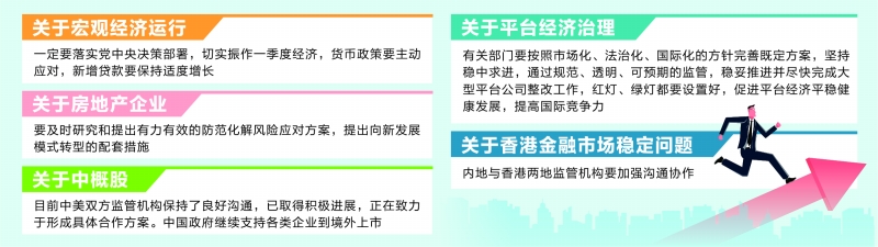 会议研究了相关问题。关于宏观经济运行,一定要落实党中央决策部署,切实振作一季度经济,货币政策要主动应对,新增贷款要保持适度增长。关于房地产企业,要及时研究和提出有力有效的防范化解风险应对方案,提出向新发展模式转型的配套措施。关于中概股,目前中美双方监管机构保持了良好沟通,已取得积极进展,正在致力于形成具体合作方案。中国政府继续支持各类企业到境外上市。关于平台经济治理,有关部门要按照市场化、法治化、国际化的方针完善既定方案,坚持稳中求进,通过规范、透明、可预期的监管,稳妥推进并尽快完成大型平台公司整改工作,红灯、绿灯都要设置好,促进平台经济平稳健康发展,提高国际竞争力。关于香港金融市场稳定问题,内地与香港两地监管机构要加强沟通协作。
