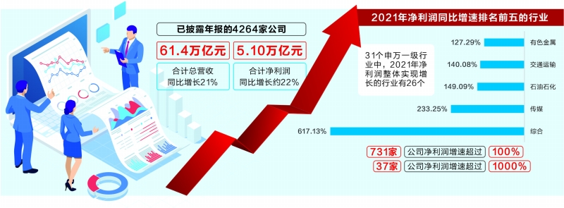 2021年年报披露收官在即,截至4月28日证券时报记者发稿,A股2021年成绩单的全貌已大致呈现。Wind统计数据显示,已披露年报的4264家公司合计实现总营收61.4万亿元,按可比口径计同比增长21%;合计净利润5.10万亿元,同比增长约22%。