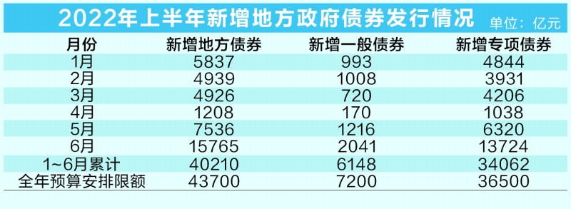 7月26日,财政部公布2022年6月地方政府债券发行和债务余额情况。数据显示,1~6月全国发行新增债券40210亿元,其中一般债券6148亿元、专项债券34062亿元。6月份,新增地方债尤其是新增专项债发行规模达到今年最高峰,分别为15765亿元和13724亿元。
