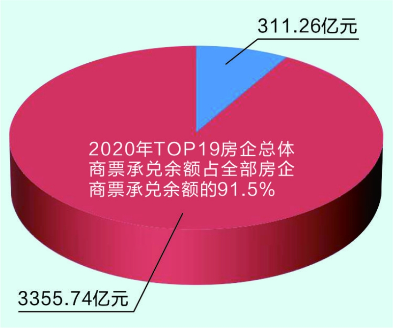 因此,携规模优势,在上下游产业链掌握话语权的头部房企,应付票据金额近年来迅速走高。上海票据交易所数据显示,2020年TOP19房企总体商票承兑余额达到3355.74亿元,较2019年增长36.59%,占全国商票承兑总量的9.27%。