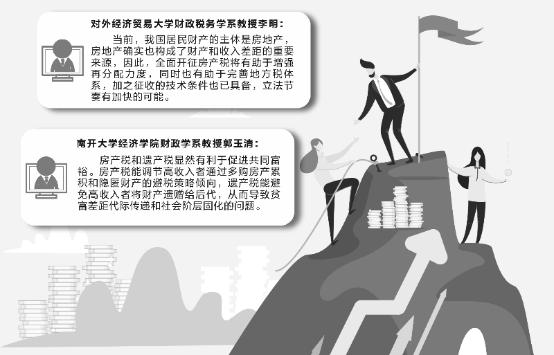 李明认为,当前,我国居民财产的主体是房地产,房地产确实也构成了财产和收入差距的重要来源,因此,全面开征房产税将有助于增强再分配力度,同时也有助于完善地方税体系,加之征收的技术条件也已具备,立法节奏有加快的可能。而遗产税的情况则稍微复杂,当前老龄化程度还不算太高,遗产税发挥作用尚需时间,近年来一些国家和地区甚至废除了遗产税,所以我国开征遗产税可能还需要研究论证,至少短期内作用空间不大。