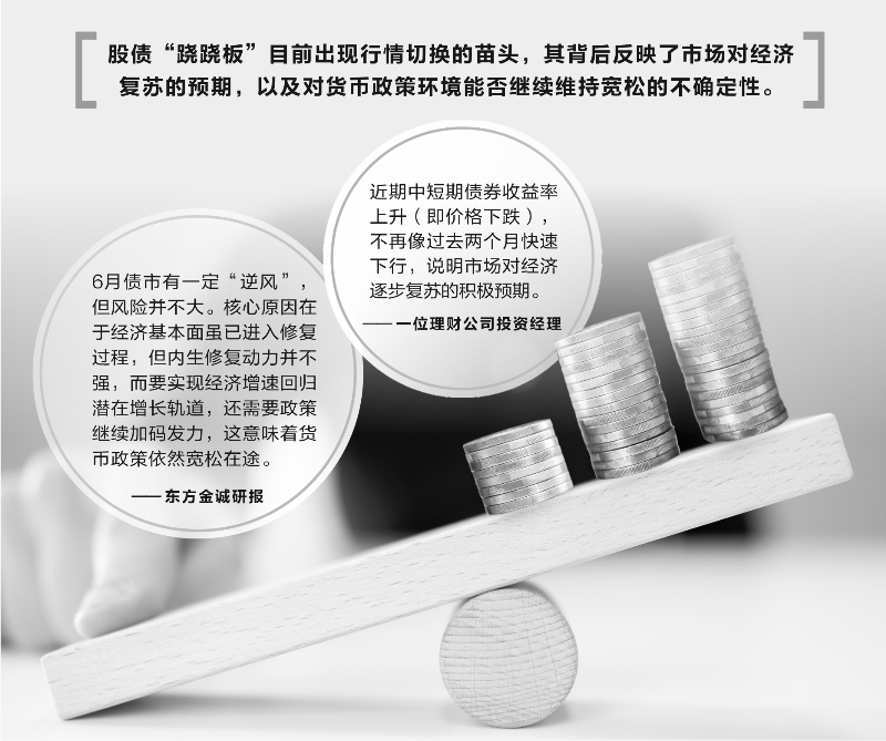 股债“跷跷板”目前出现行情切换的苗头,其背后反映了市场对经济复苏的预期,以及对货币政策环境能否继续维持宽松的不确定性。不过,多位受访的分析人士预计,尽管5月中下旬以来,各大银行“冲刺”加大信贷投放力度,当月新增信贷有望实现同比多增,但结构可能仍不乐观。目前经济恢复势头依然较弱,在信贷总量增长的稳定性得到巩固之前,货币政策仍有必要维持宽松环境,并继续加强逆周期调节。在此背景下,即便当前债市出现一定回调,预计会窄幅波动保持相对稳定。