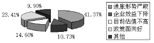 从近期国内外股市的回落来看,全球所面临的通胀对股市造成巨大冲击,越南股市深跌,而6月26日美国市场所出现的调整主要在于投资者担心通胀持续升温,国际油价持续上升,屡创新高。而从我国来看,虽然5月份CPI增速有所回落,但PPI则连创新高,国内所面临的通胀压力并不轻,不排除后续进一步提高存款准备金率或加息等紧缩性货币政策的可能性。事实上,根据“主导你对目前股市看法的最大的因素是什么?”的调查结果,其中选择“通胀形势严峻”、“企业效益下降”、“目前估值不高”、“政策面向好”和“其他”的票数分别为1145票、297票、404票、648票和274票,所占比例分别为41.37%、10.73%、14.60%、23.41%和9.90%。该项投票中超过四成投资者担忧通胀形势严峻。不过从另一方面看,近期管理层频频发出稳定和维护资本市场健康发展的论调,而部分上市公司大股东表示所持股份延长锁定期或抬高最低减持价格,这些积极的信息对投资者判断后市也具有较大的影响。