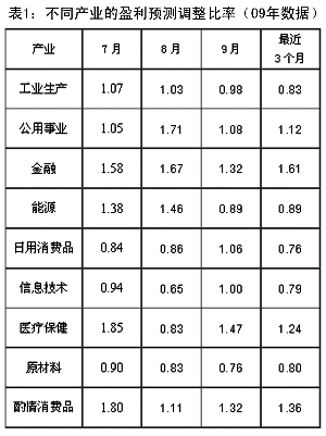 本期9大产业2009年盈利预测调整比率(3个月和1个月)仍然只有4大产业大于1、盈利预测调整比率(1个月)有6大产业大于1,但从调整比率近两期见的变动可以发现上市公司盈利增长的调高动能不足(详见表1)。从数据的整体变动情况可以看出,防御性行业重获青睐,而能源、金融、工业生产等周期性行业的调高动能明显不足。