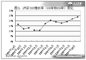 沪深300成份股2009年盈利预测增长率为23.93%,较上期小幅上调2.00 %,这些公司2008年盈利增长率为-14.58%。图2给出了分析师对沪深300预测增长率(2008年和2009年)变化趋势。