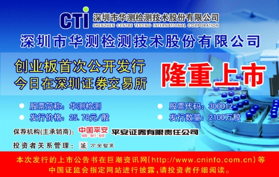 深圳市华测技术股份有限公司 创业板首次公开发行今日在深圳证券交易所隆重上市