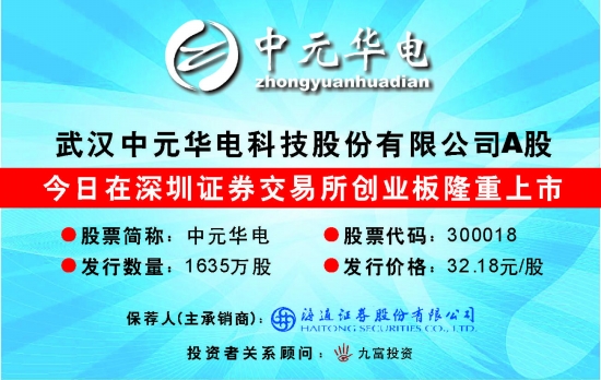 武汉中元华电科技股份有限公司A股今日在深圳证券交易所创业板隆重上市
