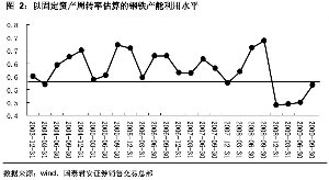产能利用率、价格的历史关系(价格滞后产能一个季度):用固定资产周转率代替产能利用率(单位固定资产生产产品的成本价值),然后用价格指数调整,我们认为2009年三季度,在7月份钢价大幅上涨后,产能释放极为迅速,造成了价格的下跌。但是这也形成了稳定的需求与价格的关系组合。类似于2003年底、2004年初的组合。如果需求进一步释放,那么将会出现量价同时上升的状态。