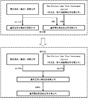 2008年3月,商社集团将其持有的商社电器100%股权无偿划转给新世纪百货。2008年4月30日, 商社集团通过重庆市联合产权交易所的公开交易程序转让新世纪百货公司25%的产权,并于2008年5月27日,征集到一家意向受让方,即新天域湖景。以评估值作为产权出资作价依据,新天域湖景以其持有的重庆商社新世纪百货公司25%的产权以及32,331.78万元的现金,与商社集团持有的重庆商社新世纪百货公司75%的产权共同出资将重庆商社新世纪百货公司改制设立为中外合资有限责任公司。改制后,商社集团和新天域湖景分别持有新世纪百货61%和39%的股权。