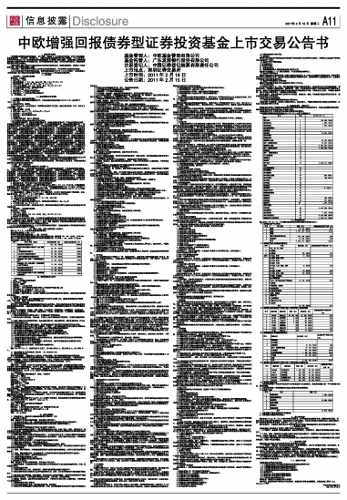 中欧增强回报债券型证券投资基金上市交易公告书 2011-02-15 来源:证券时报网 作者: