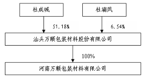 其中:报告期内公司向控股股东及其子公司提供资金的发生额 0.00万元,余额0.00万元。 5.6 委托理财 □ 适用 √ 不适用 5.7 承诺事项履行情况 √ 适用 □ 不适用 (一)公司股票发行前股东所持股份的流通限制和自愿锁定股份的承诺: 公司控股股东、实际控制人杜成城承诺:自公司股票上市之日起三十六个月内,不转让或者委托他人管理其直接或间接持有的发行人公开发行股票前已发行的股份,也不由发行人回购其直接或间接持有的发行人公开发行股票前已发行的股份。 公司股东杜端凤承诺:自公司股票上市之日起三十六个月内,不转让或者委托他人管理其直接或间接持有的发行人公开发行股票前已发行的股份,也不由发行人回购其直接或间接持有的发行人公开发行股票前已发行的股份。 公司董事杜成城、蔡懿然、周前文,高级管理人员韩啸同时承诺:除前述锁定期外,在其任职期间每年转让的股份不得超过其所持有本公司股份总数的百分之二十五;离职后半年内,不转让其所持有的本公司股份;在申报离任六个月后的十二个月内通过证券交易所挂牌交易出售本公司股票数量占其所持有本公司股票总数的比例不超过百分之五十。 (二)避免同业竞争承诺 为切实履行控股股东义务,保证股份公司及股份公司其他股东利益不受损害,本公司控股股东、实际控制人杜成城出具了《避免同业竞争承诺函》,承诺如下:“本人保证,本人及本人所控制的其他企业(经济实体)将不从事与股份公司相同、类似以及其他可能与股份公司构成竞争的业务;如股份公司业务发生变更,本人保证,本人及本人所控制的其他企业(经济实体)将不从事与股份公司业务相同、类似以及其他可能与股份公司构成竞争的业务;如本人及本人所控制的其他企业(经济实体)违反上述保证与承诺,给股份公司造成经济损失的,本人同意赔偿股份公司因此遭受的全部损失;上述承诺在本人作为股份公司第一大股东或实际控制人期间持续有效;以上承诺为不可撤销之承诺。” (三)关于住房公积金承诺 公司 2009年11月之前未执行住房公积金制度。原因为:一是公司员工工资中已含有住房补贴;二是部分员工流动性较大,不愿意缴纳住房公积金中应由自己承担的部分。2009年11月,公司已与汕头市住房公积金管理中心进行协调,建立了住房公积金制度,并为全体员工缴纳了住房公积金。公司控股股东及实际控制人杜成城于2009年11月特就上述事项承诺如下:若汕头万顺包装材料股份有限公司(以下简称“汕头万顺”) 被要求为其员工补缴或者被追偿 2009年11月之前的住房公积金,或者发生职工追索住房公积金及因此引起的诉讼、仲裁或受到有关行政管理机关的行政处罚,本人承诺承担相应赔偿责任及全部费用,以保证汕头万顺的利益不因此而受到损害。 (四)关于诉讼事项为维护公司利益作出承诺 针对东南公司诉本公司和陈小勇侵害商业秘密纠纷一案,公司控股股东、实际控制人杜成城做出承诺:如果出现败诉结果,愿意以自有财产承担与案件有关的全部经济赔偿责任,保证汕头万顺包装材料股份有限公司的利益不因此而遭受损害。 该案件已于2009年12月经广东省高级人民法院终审判决,判决结果:驳回原告东南公司上诉请求,维持原判,该判决为终审判决。 (五)关于可能补缴个人所得税情况承诺 2007年9月,万顺有限以截至2007年6月30日的未分配利润转增资本9,000万元,按转增前出资比例分别增加杜成城、杜端凤的出资额8,100万元和900万元。万顺有限原股东杜成城、杜端凤就将来可能出现的补缴个人所得税情况,作出承诺:“若日后国家税务主管部门要求杜成城、杜端凤补缴因享受有关税收优惠政策而免缴的个人所得税,则杜成城与杜端凤将以承担连带责任方式,无条件全额承担公司上市前应代扣代缴的税款及/或因此所产生的所有相关费用,以保证公司的利益不因此而受到损害”。 (六)关于追缴所得税可能作出承诺 从1998年成立至2006年,经税务机关批准,发行人以核定征收方式缴纳企业所得税。如果有关税务机关认为,公司从1998年至2004年期间不符合核定征收方式的条件,则公司存在对该期间的企业所得税按照查账征收方式追缴的可能。为此,公司实际控制人杜成城做出承诺:若税务主管部门对公司1998年至2004年期间的企业所得税按照查账征收方式追缴,则由杜成城无条件全额承担应补交的税款及/或因此所产生的所有相关费用,以保证公司的利益不因此而受到损害。 (七)关于业绩补偿承诺 根据上海东洲资产评估有限公司出具的沪东洲资评报字第DZ100557014号 《企业价值评估报告》和沪东洲资评报字第DZ100558014 号《企业价值评估报告》,江苏中基和江阴中基2010 年、2011年、2012 年三年净利润之和分别为9,161.26 万元、9,428.94 万元、11,414.37 万元,2010 年—2012 年江苏中基和江阴中基净利润总和为30,004.57万元。 本次交易实施完毕后,万顺股份实际控制人杜成城保证江苏中基和江阴中基2010 年—2012 年三年净利润总和不低于30,004.57 万元。若上述盈利承诺未能实现,杜成城将在万顺股份2012 年年报公告之日起30 个交易日内,以现金方式一次性向万顺股份补足该期间实际盈利数与承诺业绩之间的差额部分,差额部分确认方式如下: N=(9,161.26万元+9,428.94万元+11,414.37万元)*75%—(A2010+ A2011+ A2012)*75% 其中:N 为杜成城应一次性补足的数额 A2010为江苏中
