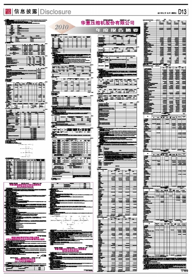 | 处置子 法定代表人:刘体斌 主管会计工作负责人:吴巍屿 会计机构负责人:曾志强 合并所有者权益变动表(1/2) 编制单位:华意压缩机股份有限公司 2010年度 单位:元 法定代表人:刘体斌 主管会计工作负责人:吴巍屿 会计机构负责人:曾志强 合并所有者权益变动表(2/2) 编制单位:华意压缩机股份有限公司 2010年度 单位:元 法定代表人:刘体斌 主管会计工作负责人:吴巍屿 会计机构负责人:曾志强 母公司所有者权益变动表(1/2) 编制单位:华意压缩机股份有限公司 2010年度 单位:元 ■ 法定代表人:刘体斌 主管会计工作负责人:吴巍屿 会计机构负责人:曾志强 母公司所有者权益变动表(2/2) 编制单位:华意压缩机股份有限公司 2010年度 单位:元 ■ 法定代表人:刘体斌 主管会计工作负责人:吴巍屿 会计机构负责人:曾志强 9.3 与最近一期年度报告相比,会计政策、会计估计和核算方法发生变化的具体说明 √ 适用 □ 不适用 ■ 9.4 重大会计差错的内容、更正金额、原因及其影响 □ 适用 √ 不适用 9.5 与最近一期年度报告相比,合并范围发生变化的具体说明 √ 适用 □ 不适用 ■ 法定代表人(签名): 华意压缩机股份有限公司 董 事 会 二〇一一年二月十八日