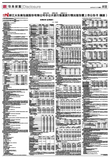 保荐机构(主承销商):浙商证券有限责任公司 二〇一一年九月 公司全体董事承诺本发行情况报告暨上市公告书摘要不存在虚假记载、误导性陈述或重大遗漏,并对其真实性、准确性、完整性承担个别和连带的法律责任。 重要声明 本公告的目的仅为向投资者提供有关本次发行的简要情况,投资者欲了解更多信息,应仔细阅读《浙江大东南包装股份有限公司非公开发行股票发行情况报告暨上市公告书》(全文)。 特别提示 一、发行股票数量及价格 发行股票数量:13,779.5966万股人民币普通股(A股) 发行股票价格:9.35元/股 募集资金总额:128,839.22821万元 募集资金净额:126,125.44861万元 二、本次发行股票上市时间 股票上市时间:2011年9月20日 股票上市数量:13,779.5966万股 根据深圳证券交易所相关业务规则的规定,公司本次发行新增股份上市首日(2011年9月20日)公司股价不除权,股票交易设涨跌幅限制。 三、各投资者所认购股份的限售期 本次非公开发行股票的限售期从新增股份上市首日起算,控股股东浙江大东南集团有限公司认购的股票限售期为三十六个月,可上市流通时间为2014年9月22日;其他7名投资者认购的股票限售期为十二个月,可上市流通时间为2012年9月20日。 四、资产过户情况 本次发行的股票全部以现金认购,不涉及资产过户情况。 五、股权结构情况 本次非公开发行股票完成后,公司股权分布符合《深圳证券交易所股票上市规则》规定的上市条件。 一、本次发行概况 (一)本次发行履行的相关程序 1、本次发行履行的内部决策过程 大东南非公开发行股票方案经由2011年1月27日召开的第四届董事会第二十五次会议、2011年2月21日召开的2010年年度股东大会和2011年5月26日召开的第四届董事会第二十九次会议审议通过。 2、本次发行监管部门核准过程 大东南本次非公开发行股票于2011年7月6日经中国证券监督管理委员会发行审核委员会审核通过,并于2011年8月10日获得中国证监会下发的《关于核准浙江大东南包装股份有限公司非公开发行股票的批复》(证监许可[2011]1253号)的核准批文。 3、募集资金验资情况 2011年9月8日,本次非公开发行股票的验资工作全部完成,公司向大东南集团等共计8名特定对象共发行13,779.5966万股人民币普通股(A股)。 根据中汇会计师事务所有限公司2011年9月7日出具的中汇会验[2011]2293号《验资报告》:截至2011年9月6日止,保荐人(主承销商)指定的收款银行账户已收到8家认购对象缴纳的认购大东南非公开发行股票的认购资金合计1,288,392,282.10元。 根据中汇会计师事务所有限公司2011年9月8日出具的中汇会验[2011]2296号《验资报告》:截至2011年9月7日止,公司实际已采用非公开发行股票的方式向特定投资者发行了人民币普通股137,795,966股,每股发行价9.35元,应募集资金总额为1,288,392,282.10元,减除发行费用27,137,796元后,募集资金净额为1,261,254,486.10元。其中:计入股本为137,795,966元,计入资本公积(资本溢价)为1,123,458,520.10元。新增注册资本均以货币资金出资。 4、新增股份登记情况 本次发行新增股份已于2011年9月13日在中国证券登记结算有限责任公司深圳分公司办理完毕股份登记手续。本次发行新增股份的性质为有限售条件股份,登记机构按发行对象承诺的限售时间对新增股份进行了限售处理,并向公司出具了股份登记完成的相关证明文件。 (二)本次发行基本情况 1、发行股票的类型、面值和数量 本次发行的股票种类为人民币普通股(A股),股票面值为1.00元/股。根据投资者认购情况,本次发行A股共计13,779.5966万股,全部采取向特定投资者非公开发行股票的方式发行。 2、发行价格 本次发行的股票发行价格为9.35元/股,该发行价格相当于根据公司第四届董事会第二十五次会议决议公告日(2011年1月31日)前20个交易日大东南股票均价的90%确定的发行底价8.77元/股(备注:原定发行底价为8.87元。2011年2月21日,公司2010年年度股东大会审议通过《2010年度利润分配预案》,以2010年末总股本为基数,向全体股东每10股派发现金股利1元(含税)。2011年4月20日,公司完成股利分配。本次发行底价相应调整至8.77元。)的106.61%;相当于发行日(2011年8月12日)前20个交易日大东南股票均价10.75元/股的86.98%。 3、本次发行对象的申购报价及股票获配情况 发行人和浙商证券根据公司股东大会审议通过的发行方案,结合发行对象申购报价的情况,并遵循本次发行《认购邀请书》中规定的定价及股份配售原则,确定大东南集团、5家机构投资者和2位自然人为本次发行的配售对象,其申购报价及获配售的情况如下: