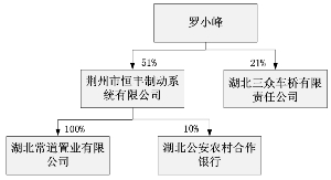 第一节 信息披露义务人介绍 一、信息披露义务人基本情况 1、信息披露义务人名称:荆州市恒丰制动系统有限公司 2、法定代表人:罗小峰 3、注册资本:10,000万元 4、企业法人营业执照注册号:421022000012939 5、企业类型:有限责任公司 6、住所:湖北省公安县斗湖堤镇孱陵大道创业路 7、经营范围:制动系统研发、制造、销售;其他汽车配件制造、铸造、加工、销售。 8、经营期限:长期 9、组织结构代码:78816166-9 10、税务登记证号: 421022120051564 11、股东姓名:罗小峰持股51%,卢娅妮持股49% 12、邮政编码:434300 13、联系电话:0716-5151212 二、信息披露义务人的股权结构及控制关系 (一)股权结构 恒丰制动成立于2006年4月27日,设立时注册资本为500万元,股东徐增法、牟选民和院坚军均已现金出资,持股比例分别为40%、40%和20%;2006年10月24日,院坚军将其持有的恒丰制动20%股权转让给徐增法;2007年3月12日,徐增法、牟选民分别将其持有的恒丰制动60%、40%股权转让给张远珍;2010年6月1日,张远珍对恒丰制动增资,其中以货币增资300万元,以实物增资570万元,以无形资产(土地使用权)增资130万元,本次增资完成后,恒丰制动的注册资本增至1,500万元。2011年9月,股东张远珍以货币资金100万元对恒丰制动增资,本次增资后,恒丰制动注册资本增至1,600万元。此次增资经湖北大信瑞达信会计师事务有限公司鄂瑞会验字(2011)70号验资报告验证确定,并于2011年10月11日办理了工商变更手续。2011年10年14日,张远珍将其持有的恒丰制动100%股权转让给罗小峰(张远珍和罗小峰为夫妻关系)。2011年10月17日,罗小峰以货币资金3,500万元对恒丰制动增资,本次增资后,恒丰制动注册资本增至5,100万元。此次增资经湖北大信瑞达信会计师事务有限公司鄂瑞会验字(2011)第072号验资报告验证确定。卢娅妮于2011年10月20日对恒丰制动增资4,900万元,增资后恒丰制动注册资本增至10,000万元,本次增资已经湖北大信瑞达信会计师事务有限公司鄂瑞会验字(2011)第073号验资报告验证确定。目前恒丰制动的股东为罗小峰和卢娅妮,其相关产权关系如下图所示: ■ (二)信息披露义务人控股股东及实际控制人 2011年10月28日,罗小峰和卢娅妮签订了《一致行动人协议》,约定双方就有关上市公司经营发展的重大事项行使表决权之前,一致行动人内部先对相关议案或表决事项进行协调,直至达成一致意见。罗小峰和卢娅妮合计持有恒丰制动100%股权,因此恒丰制动的实际控制人为罗小峰先生和卢娅妮女士。 罗小峰,男,1971年10月出生,中国国籍,身份证号码:42102219711006****,未取得其他国家或地区永久居留权,住所:湖北省公安县斗湖堤镇新建街39号。 2000年5月至今,罗小峰先生创办民营企业, 2005年被评为“公安县十大优秀青年”,2006年被评为“工业兴县”先进个人,2007年被评为“公安县劳动模范”。2007年任公安县政协常委,2010年10月当选为荆州市人大代表,现任荆州市恒丰制动系统有限公司执行董事。 卢娅妮,女,1976年8月出生,中国国籍,身份证号码:42102219760808****,未取得其他国家或地区永久居留权,住所:湖北省公安县斗湖堤镇横堤街3号。 卢娅妮女士毕业于武汉大学,2003年5月至今,任荆州车桥有限公司董事长。2010年7月至今,任湖北车桥有限公司总经理。 三、罗小峰和卢娅妮控制的核心企业和核心业务、关联企业及主营业务情况 (一)截至本报告书签署之日,罗小峰先生控制的核心企业和核心业务、关联企业及主营业务的情况如下: ■