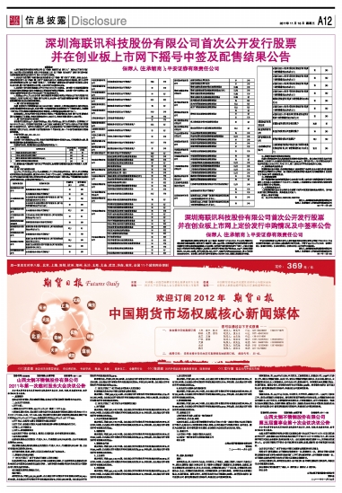深圳海联讯科技股份有限公司首次公开发行股票并在创业板上市网下摇号中签及配售结果公告